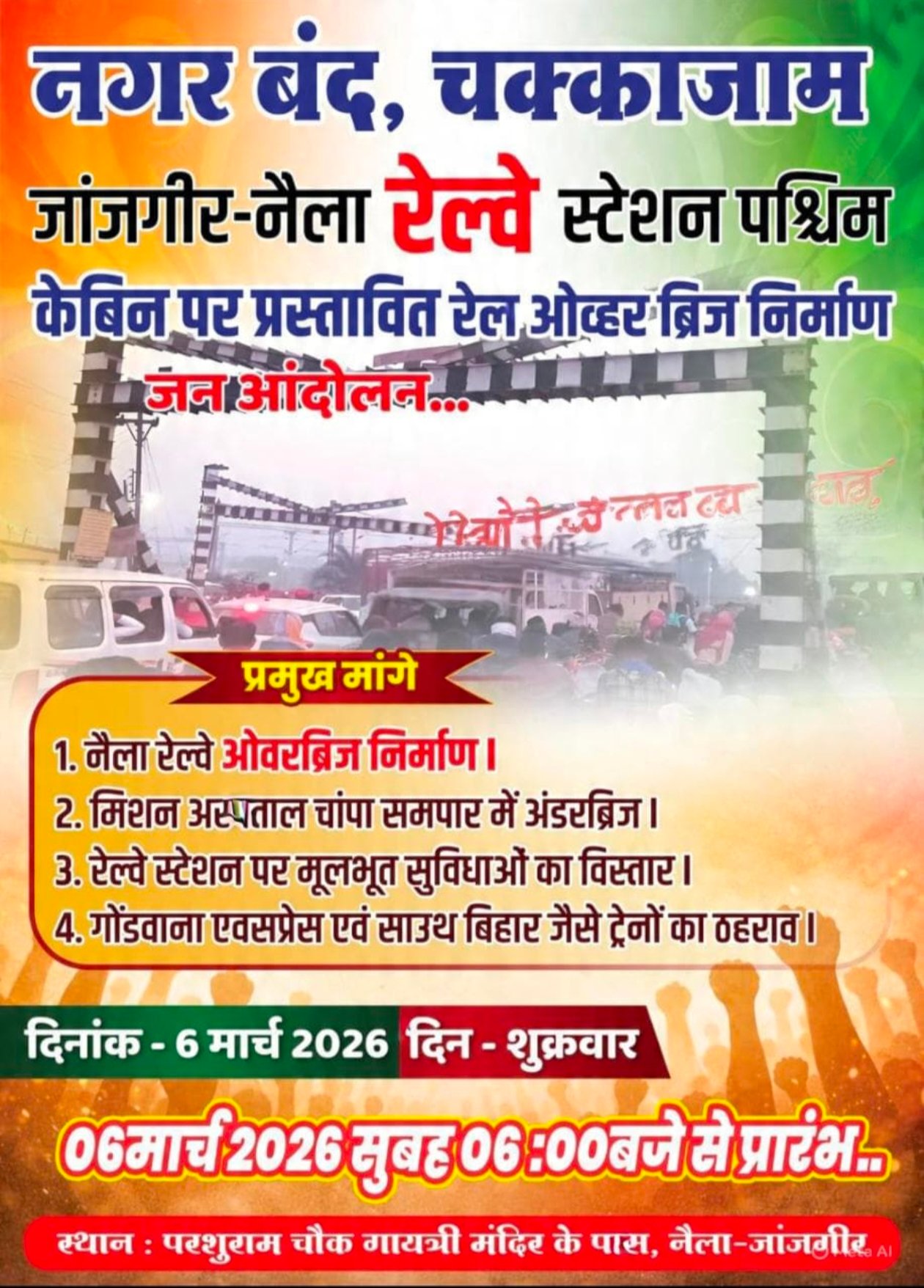 जांजगीर चाम्पा। रिपोर्ट कृष्णा टण्डन। जिले के नैला जांजगीर में क्षेत्रीय विधायक ब्यास कश्यप के द्वारा जनहित से जुड़ी नैला रेल्वे ओवरब्रिज निर्माण,मिशन अस्पताल चाम्पा समपार में अंडरब्रिज,रेल्वे स्टेशन में मूलभूत सुविधाओं का विस्तार,गोंडवाना एक्सप्रेस और साउथ बिहार जैसे ट्रेनों का ठहराव,और विभिन्न मांगों को लेकर क्षेत्रीय विधायक व्यास कश्यप के नेतृत्व में समस्त कांग्रेस कार्यकर्ताओं और स्थानीय लोगों ने चक्काजाम कर विरोध प्रदर्शन किया। इस दौरान बड़ी संख्या में कांग्रेस जिलाध्यक्ष राजेश अग्रवाल,दिनेश शर्मा,भगवान दास गढ़ेवाल,रामविलास राठौर,ऋषि उपाध्यक्ष, सुनील साधवानी,किशोर साव,आकाश शर्मा,जितेंद्र दिनकर,सहित समर्थक सड़क पर उतर आए और प्रशासन के खिलाफ नारेबाजी करते हुए अपनी मांगों को जल्द पूरा करने की मांग कर रहे हैं। विधायक व्यास कश्यप ने कहा कि क्षेत्र की जनता लंबे समय से बुनियादी सुविधाओं की मांग कर रही है, लेकिन प्रशासन द्वारा अब तक उचित कार्रवाई नहीं की गई है। उन्होंने कहा कि नैला रेल्वे ओवरब्रिज निर्माण,मिशन अस्पताल चाम्पा समपार में अंडरब्रिज,रेल्वे स्टेशन में मूलभूत सुविधाओं का विस्तार,गोंडवाना एक्सप्रेस और साउथ बिहार जैसे ट्रेनों का ठहराव,और अन्य जनहित से जुड़े मुद्दों को लेकर कई बार अधिकारियों को अवगत कराया गया, लेकिन समस्या का समाधान नहीं हुआ।